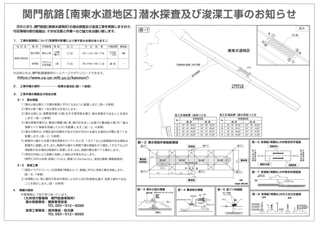 関門航路潜水探査及び浚渫工事のお知らせ Posted 2025年12月26日 by user ご安全に!雄和海運です。 関門航路における潜水探査及び浚渫工事の情報が入りましたのでお知らせします。 付近を航行する船舶はご注意ください。